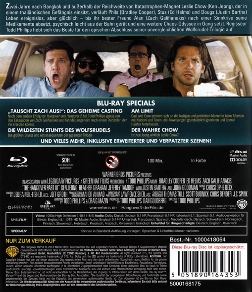 Zwei Jahre nach Bangkok und ausserhalb der Reichweite von Katastrophen-Magnet Leslie Chow (Ken Jeong), der in einem thailändischen Gefängnis einsitzt, verläuft Phils (Bradley Cooper), Stus (Ed Helms) und Dougs (Justin Bartha) Leben ereignislos, aber glücklich – bis ihr bester Freund Alan (Zach Galifianakis) nach einer Sinnkrise seine Medikamente absetzt, psychisch leicht aus der Bahn gerät und eine weitere Chaos-Odyssee in Gang setzt. Regisseur Todd Phillips hebt sich das Beste für den epischen Abschluss seiner unvergleichlichen Wolfsrudel-Trilogie auf.