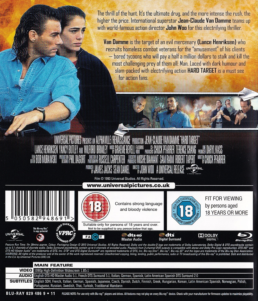 Van Damme is the target of an evil mercenary (Lance Henriksen) who recruits homeless combat veterans for the "amusement" of his clients - bored tycoons who will pay a half a million dollars to stalk and kill the most challenging prey of them all: Man. Laced with dark humour and slam-packed with electrifying action HARD TARGET is a must see for action fans.
