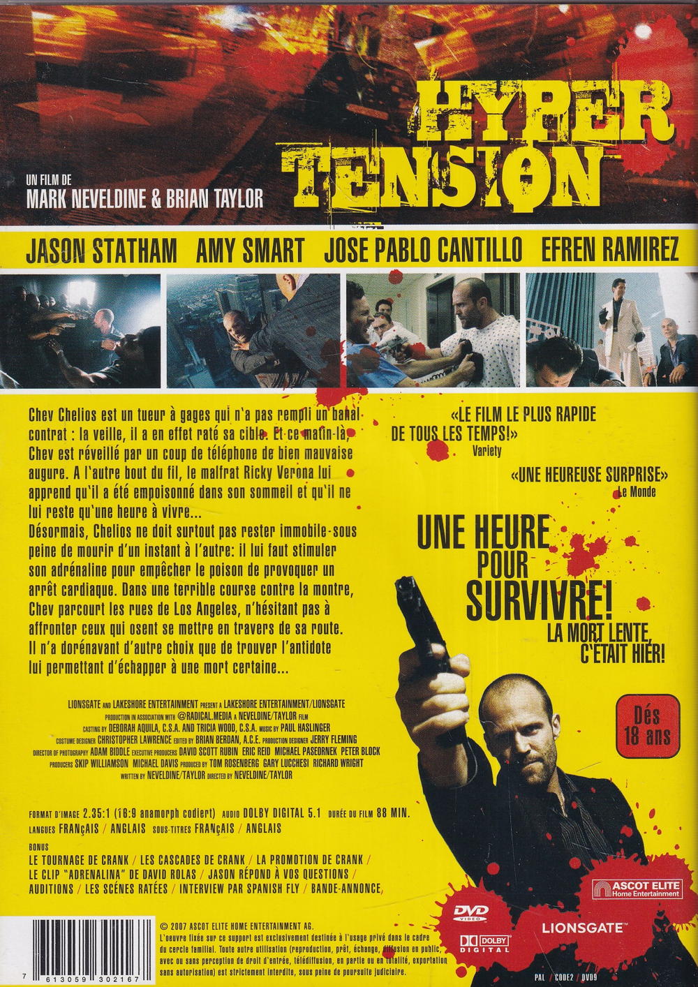 Chev Chelios est un tueur r gages qui n'a pas rempli un banal contrat: la veille, il a en effet raté sa cible. Et ce matin-lr, Chev est réveillé par un coup de téléphone de bien mauvaise augure. A l'autre bout du fil, le malfrat Ricky Verona lui apprend qu'il a été empoisonné dans son sommeil et qu'il ne lui reste qu'une heure r vivre... Désormais, Chelios ne doit surtout pas rester immobile sous peine de mourir d'un instant r l'autre: il lui faut stimuler son adrénaline pour empecher le poison de provoquer un arret cardiaque. Dans une terrible course contre la montre, Chev parcourt les rues de Los Angeles, n'hésitant pas r affronter ceux qui osent se mettre en travers de sa route. Il n'a dorénavant d'autre choix que de trouver l'antidote lui permettant d'échapper r une mort certaine.