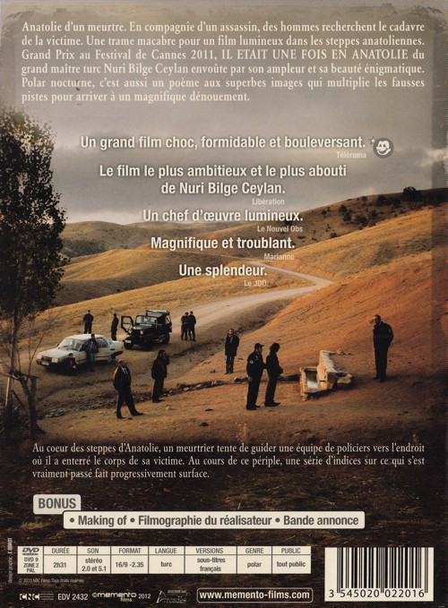 Anatolie d’un meurtre. En compagnie d’un assassin, des hommes recherchent le cadavre de la victime. Une trame macabre pour un film lumineux dans les steppes anatoliennes. Grand Prix au Festival de Cannes 2011, Il était une fois en Anatolie du grand maître turc Nuri Bilge Ceylan envoûte par son ampleur et sa beauté énigmatique. Polar nocturne, c’est aussi un poème aux superbes images qui multiplie les fausses pistes pour arriver à un magnifique dénouement.