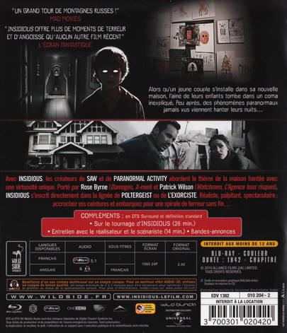 Avec INSIDIOUS, les créateurs de Saw et Paranormal Activity abordent le thème de la maison hantée avec une virtuosité unique. Porté par Rose Byrne (Damages, X-men) et Patrick Wilson (Watchmen, L’Agence tous risques), INSIDIOUS s’inscrit directement dans la lignée de Poltergeist ou de L’Exorciste.