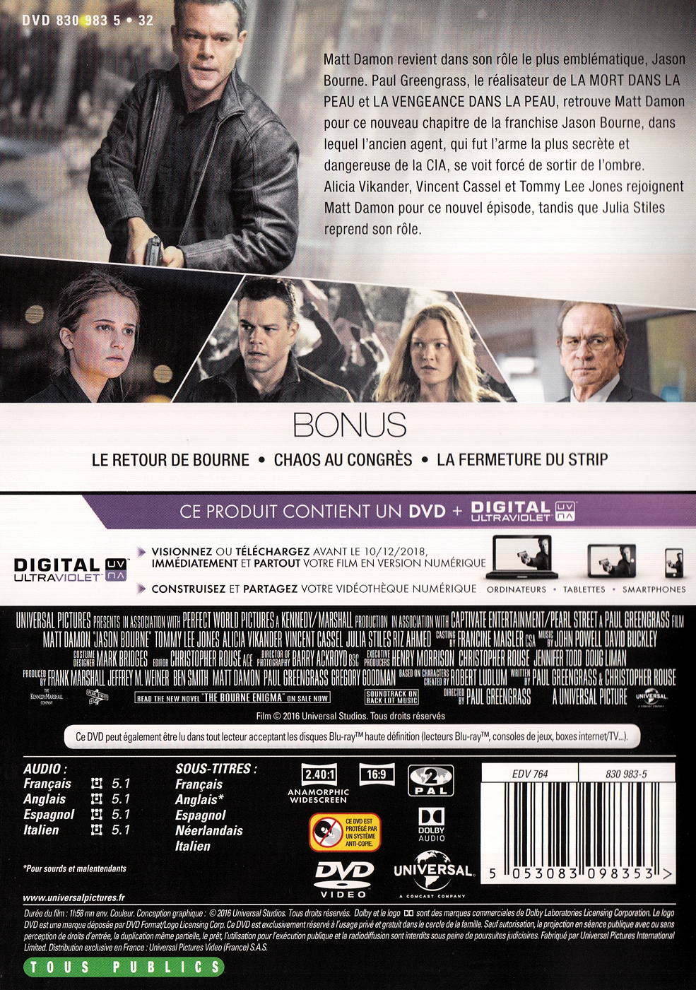 Jason Bourne est arraché de sa retraite par l'activation d'un nouveau programme développé par une infrastructure globale en réseau, aussi rapide que flexible, beaucoup plus sophistiqué et pervers que tout ce que Jason avait pu affronter jusqu'à présent... et qui dépasse les prérogatives d'un simple gouvernement. Le but ultime de cette structure ramifiée est d'instrumentaliser la terreur, grâce à internet afin de fomenter des insurrections. Tandis que l'agence reste persuadée qu'à condition qu'ils lui donnent ce qu'il veut, Bourne reviendra pour être reconditionné. L'arme la plus redoutable qu'ils aient jamais créée, reste la seule à saisir ce qui persiste à leur échapper : même endommagés, les bons soldats continuent à défendre la veuve et l'opprimé des griffes d'un pouvoir abusif... surtout quand il est hors de contrôle.