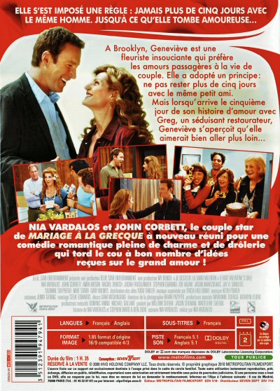 Brooklyn, Genevieve est une fleuriste insouciante qui préfère les amours passagères à la vie de couple. Elle a adopté un principe: ne pas rester plus de cinq jours avec le même petit ami. Mais lorsqu’arrive le cinquième jour de son histoire d’amour avec Greg, un séduisant restaurateur, Genevieve s’aperçoit qu’elle aimerait bien aller plus loin...