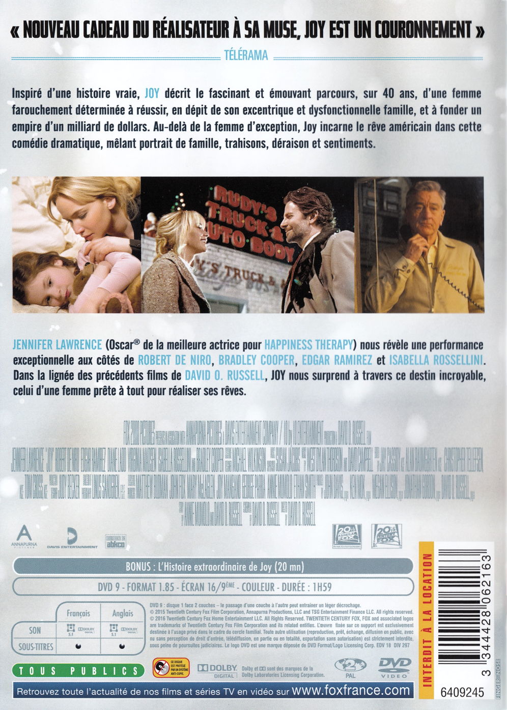 Inspiré d'une histoire vraie, Joy décrit le fascinant et émouvant parcours, sur 40 ans, d'une femme farouchement déterminée à réussir, en dépit de son excentrique et dysfonctionnelle famille, et à fonder un empire d'un milliard de dollars. Au-delà de la femme d'exception, Joy incarne le rêve américain dans cette comédie dramatique, mêlant portrait de famille, trahisons, déraison et sentiments.