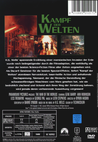 Nervenaufreibender Roman über die Invasion der Erde durch den Mars wirkt in dieser fesselnden Verfilmung aus dem Jahre 1952 sogar noch furchterregender: Dieses Meisterwerk zählt zu den grössten Science-Fiction Filmen aller Zeiten und ist unverkennbar das Vorbild vieler aktueller Sci-Fi-Streifen! Kampf der Welten - ausgezeichnet mit einem Oscar für Special Effects - ist so aufregend, dass einem fast die Augen übergehen. Gewaltige Laser-Gefechte und nicht nachlassender Nervenkitzel lassen einen vor Spannung auf dem Sitz erstarren. Keiner, der im Film die Darstellung der schwanenförmigen, marsianischen Raumschiffe gesehen hat, die bedrohlich tickend und zischend ihren Vernichtungsfeldzug fortsetzen, wird jemals diesen furchterregenden Eindruck vergessen!