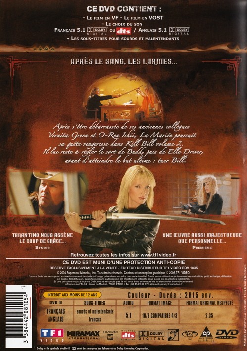 Après s'être débarrassée de ses anciennes collègues Vernita Green et O-Ren Ishii, la Mariée poursuit sa quête vengeresse. Il lui reste à régler le sort de Budd puis de Elle Driver avant d'atteindre le but ultime : tuer Bill.