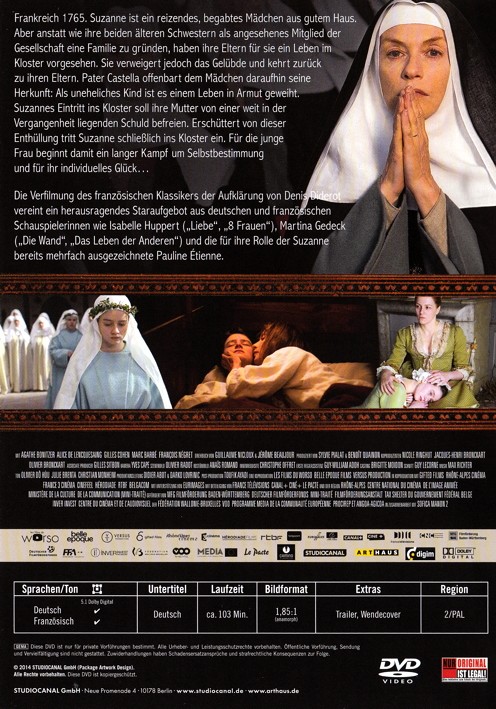 XVIIIe siècle. Suzanne, 16 ans, est contrainte par sa famille à rentrer dans les ordres, alors qu'elle aspire à vivre dans "le monde". Au couvent, elle est confrontée à l'arbitraire de la hiérarchie ecclésiastique : mères supérieures tour à tour bienveillantes, cruelles ou un peu trop aimantes... La passion et la force qui l'animent lui permettent de résister à la barbarie du couvent, poursuivant son unique but : lutter par tous les moyens pour retrouver sa liberté...