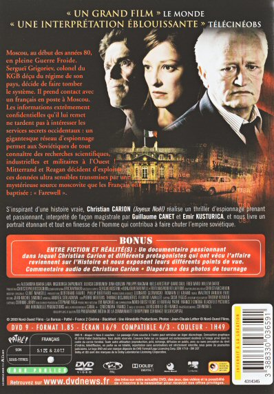 Moscou, au début des années 80, en pleine Guerre Froide. Sergueï Grigoriev, colonel du KGB déçu du régime de son pays, décide de faire tomber le système. Il prend contact avec un français en poste à Moscou. Les informations extrêmement confidentielles qu’il lui remet ne tardent pas à intéresser les services secrets occidentaux: un gigantesque réseau d’espionnage permet aux Soviétiques de tout connaître des recherches scientifiques, industrielles et militaires à l’Ouest ! Mitterrand et Reagan décident d’exploiter ces données ultra sensibles transmises par une mystérieuse source moscovite que les Français ont baptisée: "Farewell".