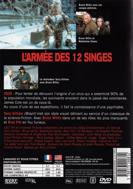 2035 : Pour tenter de découvrir l'origine d'un virus qui a exterminé 90% de la population mondiale, les survivants envoient dans le passé des volontaires. James Cole est l'un de ceux-là. Au cours d'une expédition, il fait la connaissance d'une psychiatre.