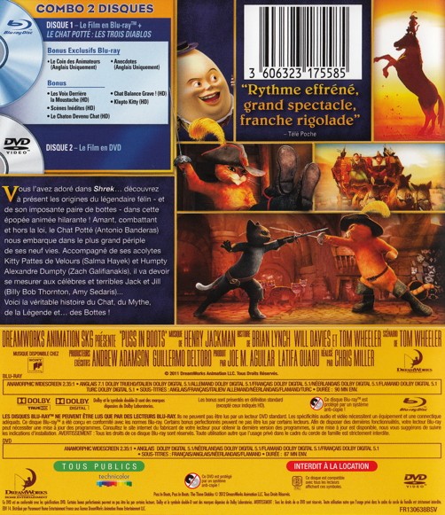 Vous l'avez adoré dans Shrek... découvrez à présent les origines du légendaire félin - et de son imposante paire de bottes - dans cette épopée animée hilarante ! Amant, combattant et hors la loi, le Chat Potté (Antonio Banderas) nous embarque dans le plus grand périple de ses neuf vies. Accompagné de ses acolytes Kitty Pattes de Velours (Selma Hayek) et Humpty Alexandre Dumpty (Zach Galifianakis), il va devoir se mesurer aux célèbres et terribles Jack et Jill (Billy Bob Thorton, Ami Sedaris)... Voici la véritable histoire du Chat, du Mythe, de la Légende et... des Bottes !