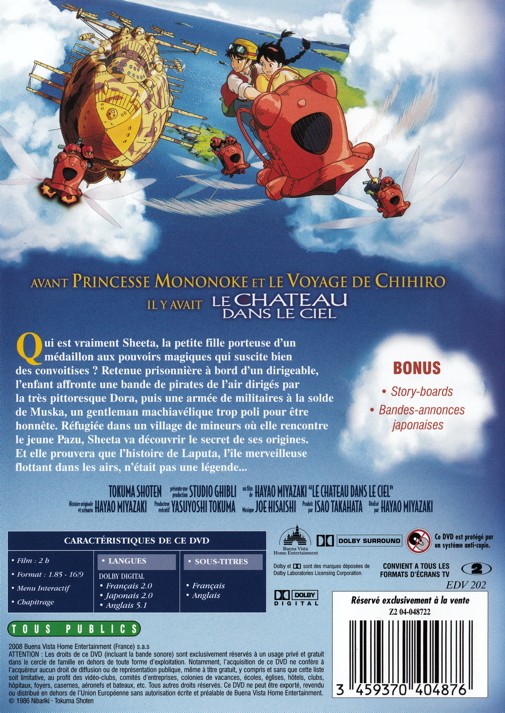 Un dirigeable en plein ciel. Sheeta une jeune fille triste, est retenue prisonnière par des hommes qui cherchent à percer un secret dont elle aurait la clé. Profitant d'une attaque de pirates du ciel, Sheeta tente de s'évader et tombe dans le vide. Pazu, un jeune garçon intrépide qui travaille à la mine voit Sheeta tomber littéralement du ciel entourée d'une lumière émanant de son pendentif. Bientôt, elle avoue à Pazu qu'elle est la descendante des souverains de la mythique cité de Laputa, le château dans le ciel...