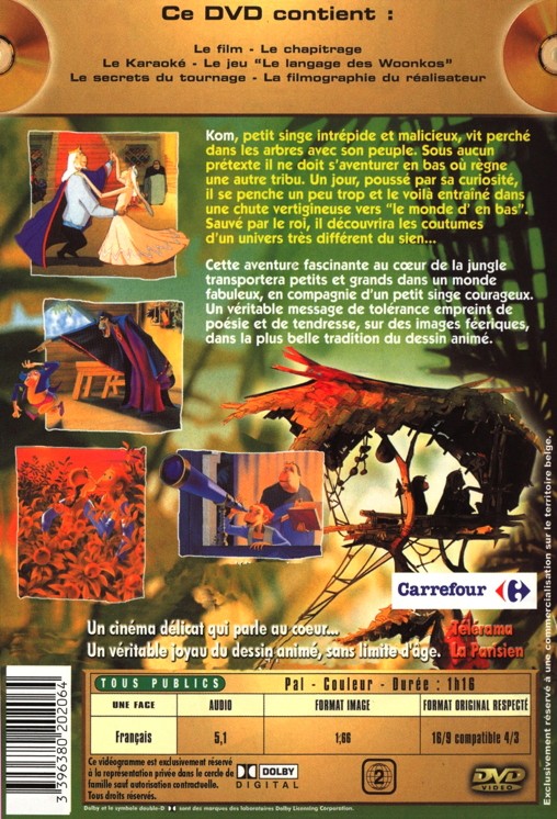 Kom, petit singe intrépide et malicieux, vit perché dans les arbres avec son peuple. Sous aucun prétexte il ne doit s’aventurer en bas où règne une autre tribu. Un jour, poussé par sa curiosité, il se penche un peu trop et le voilà entraîné dans une chute vertigineuse vers "le monde d’en bas". Sauvé par le roi, il découvrira les coutumes d’un univers très différent du sien...