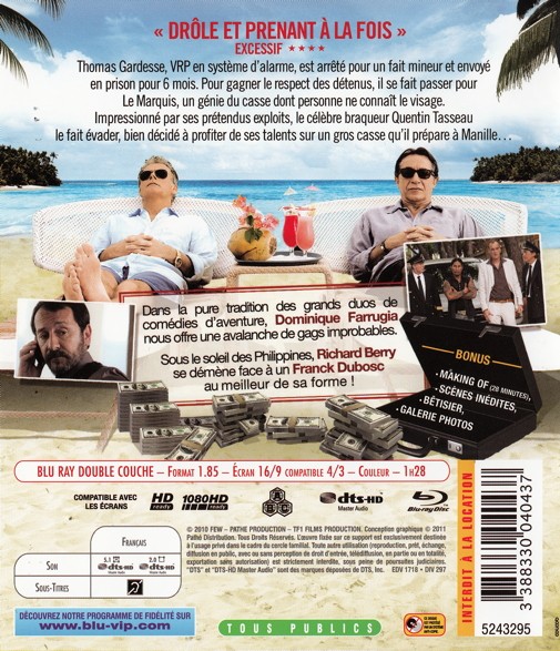 Thomas Gardesse, VRP en système d’alarme, est arrêté pour un fait mineur et envoyé en prison pour 6 mois. Afin de gagner le respect des détenus, il se fait passer pour Le Marquis, un génie du casse dont personne ne connaît le visage. Quinze jours avant sa sortie, un braqueur du nom de Quentin Tasseau le fait évader pour l’emmener à Manille afin qu’il participe à un casse dont le commanditaire a besoin des talents du Marquis…