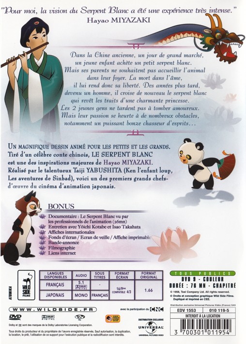 Dans la Chine ancienne, le jour du grand marché, un jeune enfant nommé Syusyen achète un petit serpent blanc. Mais ses parents ne souhaitent pas accueillir un tel animal dans leur foyer. Syusyen doit donc se résigner, la mort dans l'âme, à relâcher le reptile... Quelques années plus tard, devenu un bel homme, Syusyen croise de nouveau le serpent blanc, qui cette fois ci revêt les traits d'une charmante princesse : Painyan. Les deux jeunes gens ne tardent pas à tomber amoureux. Cependant, leur passion se heurte à de nombreux obstacles, parmi lesquels Hokaï, un puissant bonze chasseur d'esprits. Heureusement, Syusyen pourra compter sur l'aide de tous ses amis dont un adorable petit panda à la force colossale, un mignon chaton intrépide et une bande de petits animaux patibulaires convertis à sa cause.
