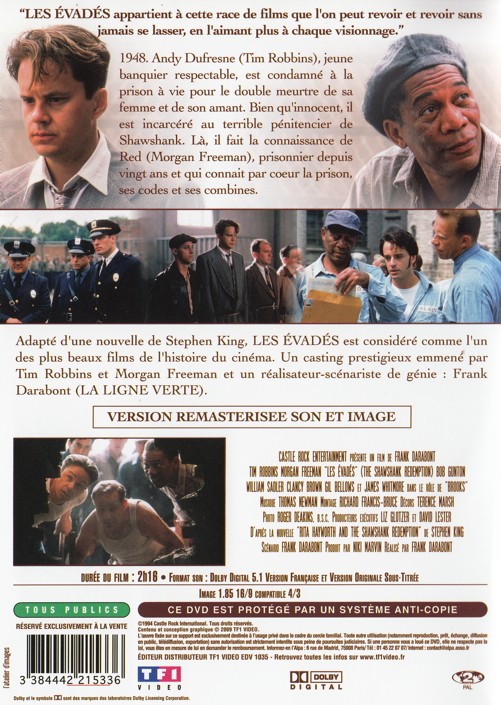 1948. Andy Dufresne, jeune banquier respectable, est condamné à la prison à vie pour le double meurtre de sa femme et son amant. Bien qu'innocent, il est incarcéré au terrible pénitencier de Shawshank. Là, il fait la connaissance de Red, prisonnier depuis vingt ans et qui connaît par coeur la prison, ses codes et ses combines.