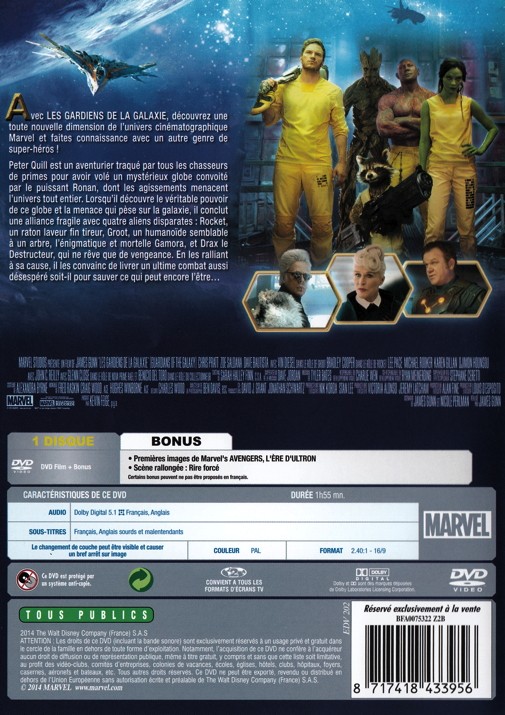 Peter Quill est un aventurier traqué par tous les chasseurs de primes pour avoir volé un mystérieux globe convoité par le puissant Ronan, dont les agissements menacent l’univers tout entier. Lorsqu’il découvre le véritable pouvoir de ce globe et la menace qui pèse sur la galaxie, il conclut une alliance fragile avec quatre aliens disparates : Rocket, un raton laveur fin tireur, Groot, un humanoïde semblable à un arbre, l’énigmatique et mortelle Gamora, et Drax le Destructeur, qui ne rêve que de vengeance. En les ralliant à sa cause, il les convainc de livrer un ultime combat aussi désespéré soit-il pour sauver ce qui peut encore l’être...