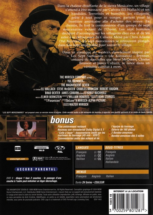 Toute leur vie, les habitants de ce petit village du Mexique se souviendront comment ils ont été sauvés des griffes du plus terrible des pillards : l'ignoble Caldera... Sept hommes mystérieux, tous venus d'horizons différents, implacables, n'obéissant qu'à la loi de leur armes, vont en effet assister les villageois dans leur combat sanglant... Mercenaires émérites et sans scrupules, ces hommes qui se rallient les causes de l'argent, vont découvrir que les raisons pour lesquelles ils sont chargés de se battre sont ici l'honneur, l'espoir et la dignité, et qu'elle ont en réalité un prix inestimable...