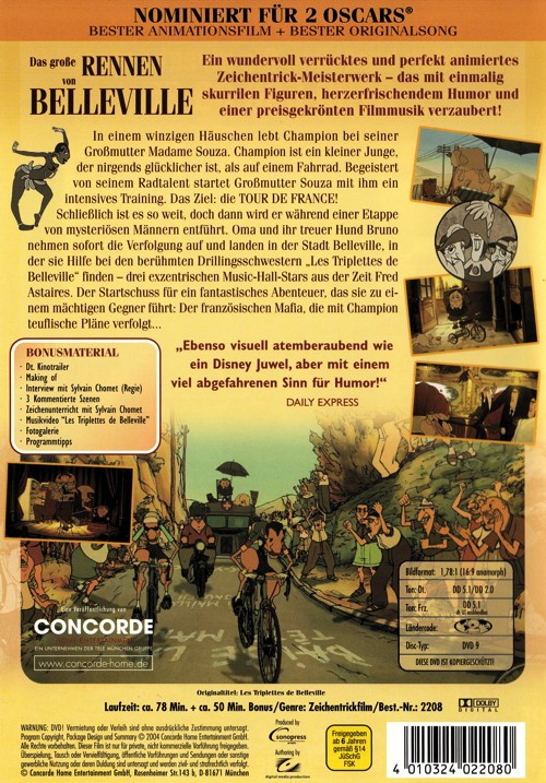 Champion est un petit garçon mélancolique adopté par sa grand-mère, Madame Souza. Remarquant sa passion pour le cyclisme, Madame Souza fait suivre à Champion un entraînement acharné. Les années passent. Champion est devenu un as de la petite reine, à tel point qu'il se retrouve coureur au célèbre Tour de France. Mais pendant la course, il est enlevé par deux mystérieux hommes en noir. Madame Souza et son fidèle chien Bruno partent alors à sa recherche. Leur quête les mène de l'autre côté de l'Océan, jusqu'à une mégalopole nommée Belleville. Là, ils rencontrent les Triplettes de Belleville, d'excentriques stars du music-hall des années 30 qui décident de prendre Madame Souza et Bruno sous leur aile. Grâce au flair de Bruno, ils se lancent sur la trace de Champion. Réussiront-ils à déjouer les plans de la puissante mafia française ?
