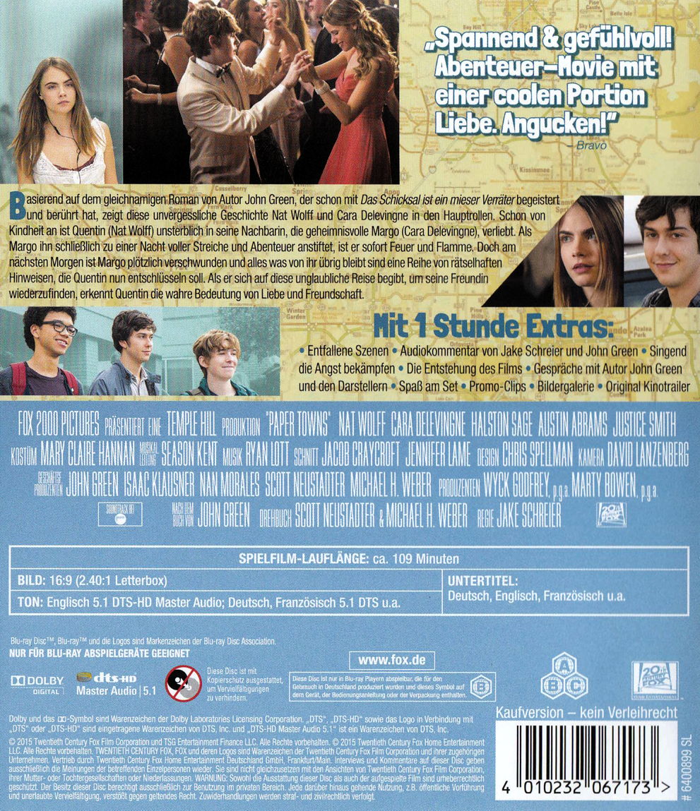 Die geheimnisvolle Margo (Cara Delevingne) ist für Quentin (Nat Wolff) das begehrenswerteste Mädchen an seiner Schule. Für eine Nacht wird Quentins Traum wahr und die beiden ziehen um die Häuser. Am nächsten Tag ist Margo verschwunden - aber nicht ohne versteckte Hinweise zu hinterlassen. Die Suche nach ihr entwickelt sich für Quentin und seine Freunde zu einem aufregenden und spannenden Abenteuer, das sie quer durch die USA führt. Bei dem Versuch, Margo und ihr Universum zu verstehen, wachsen alle Beteiligten schnell über sich hinaus, und genau darin scheint die Lösung zu liegen.