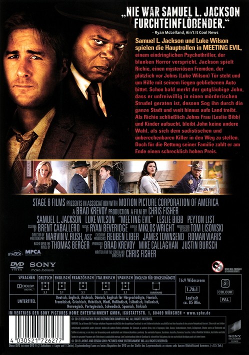 Sameuel L. Jackson und Luke Wilson spielen die Hauptrollen in MEETING EVIL, einem eindringlichen Psychothriller, der blanken Horror verspricht. Jackson spielt Richie, einen mysteriösen Fremden, der plötzlich vor Johns (Luke Wilson) Tür steht und um Hilfe mit seinem liegen gebliebenen Auto bittet. Schon bald merkt der gutgläubige John, dass er unfreiwillig in einen mörderischen Strudel geraten ist, dessen Sog ihn durch die ganze Stadt und weit hinaus aufs Land treibt. Als Richie schließlich Johns Frau (Leslie Bibb) und Kinder aufsucht, bleibt John keine andere Wahl, als sich dem sadistischen und unberenbaren Killer in den Weg zu stellen. Doch für die Rettung seiner Familie zahlt er am Ende einen schrecklich hohen Preis.