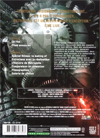 A Metropolis, humains et robots cohabitent, cantonnés dans des espaces de vie bien définis. Mais des soulèvements antirobots se multiplient, menaçant l'équilibre de la ville. Parallèlement, deux policiers, sont envoyés à la recherche du créateur de Tima, un robot ultra-perfectionné. En même temps que la cachette du génial savant, ils découvrent que ce dernier est protégé par un homme énigmatique qui projette d'utiliser Tima pour régner sur la population des robots. Un bijou du cinéma d'animation japonais.