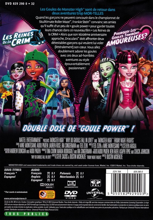 - Monster High : Les reines de la CRIM' : Quand les garçons ne peuvent concourir dans le championnat de Skultimate Roller Maze, Frankie Stein convainc ses amies qu'il suffit d'un peu de "goule power" pour garder toutes leurs chances...