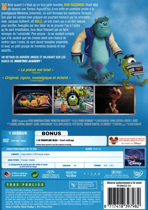 Même quand il n’était qu’un tout petit monstre, Bob Razowski rêvait déjà de devenir une Terreur. Aujourd’hui, il est enfin en première année à la prestigieuse université Monstres Academy, où sont formées les meilleures Terreurs. Son plan de carrière bien préparé est pourtant menacé par sa rencontre avec James P. Sullivan, dit Sulli, un vrai crack qui a un don naturel pour Terrifier. Aveuglés par leur désir de se prouver l’un à l’autre qu’ils sont imbattables, tous deux finissent par se faire renvoyer de l’université. Pire encore : ils se rendent compte que s’ils veulent que les choses aient une chance de rentrer dans l’ordre, ils vont devoir travailler ensemble, et avec un petit groupe de monstres bizarres et mal assortis...