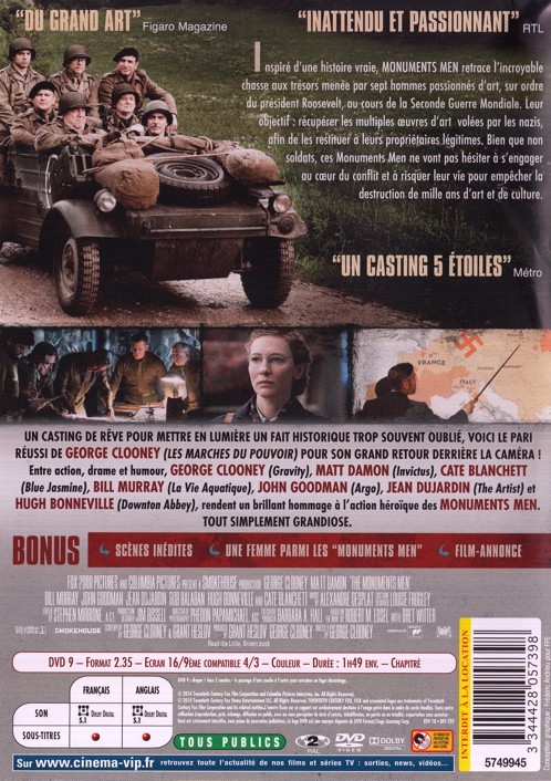 La plus grande chasse au trésor du XXe siècle est une histoire vraie. En pleine Seconde Guerre mondiale, sur ordre du président Roosevelt, sept hommes qui sont tout sauf des soldats - des directeurs et des conservateurs de musées, des artistes, des architectes, et des historiens d'art - se jettent au coeur du conflit pour aller sauver des oeuvres d'art volées par les nazis et les restituer à leurs propriétaires légitimes. Mais ces trésors sont cachés en plein territoire ennemi, et leurs chances de réussir sont infimes. Pour tenter d'empêcher la destruction de mille ans d'art et de culture, ces Monuments Men vont se lancer dans une incroyable course contre la montre, en risquant leur vie pour protéger et défendre les plus précieux trésors artistiques de l'humanité...