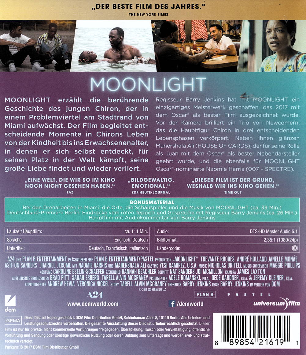 Moonlight erzählt die berührende Geschichte des jungen Chiron, der in einem Problemviertel am Stadtrand von Miami aufwächst. Der Film begleitet entscheidende Momente in Chirons Leben von der Kindheit bis ins Erwachsenenalter, in denen er sich selbst entdeckt, für seinen Platz in der Welt kämpft, seine grosse Liebe findet und wieder verliert.