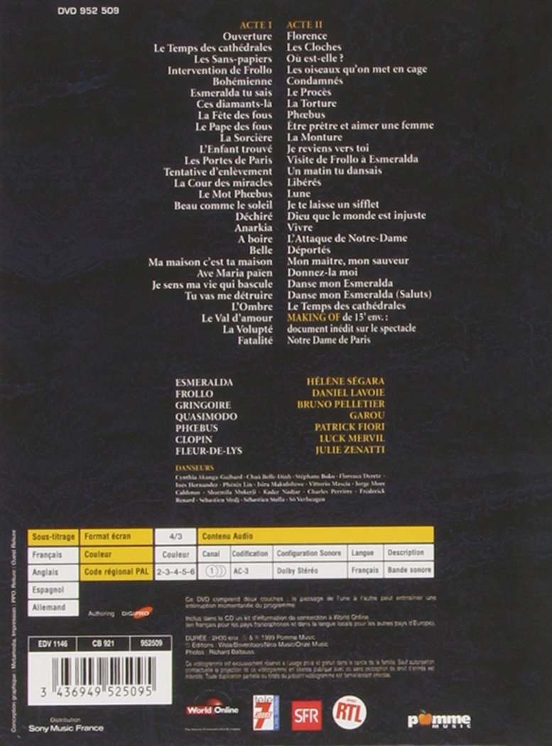 Ouverture - Le temps des cathédrales - Les sans-papiers - Intervention de Frollo - Bohémienne - Esmeralda tu sais - Ces diamants là - La fête des fous - Le pape des fous - La sorcière - L'enfant trouvé - Les portes de Paris - Tentative d'enlèvement - La cour des miracles... - Le mot de Poebus - Beau comme le solei - Déchiré - A boire - Belle - Ma maison c'est ta maison - Ave Maria païen - Je sens ma vie qui bascule - Tu vas me détruire - L'ombre - Le val d'amour - La volupté - Fatalité - Florence - Les cloches - Où est-elle ? - Les oiseaux qu'on met en cage - Condamnés - Le procès - La torture - Phoebus - Etre prêtre et aimer une femme - La monture - Je reviens vers toi - Visite de Frollo à Esmeralda - Un matin tu dansais - Libérés - Lunes - Je te laisse un sifflet - Dieu que le monde est injuste - Vivre - L'attaque de Notre-Dame - Déportés - Mon maître, mon sauveur - Donnez-la moi - Danse mon Esmeralda - Danse mon Esmeralda (saluts) - Le temps des cathédrales - Anarkia
