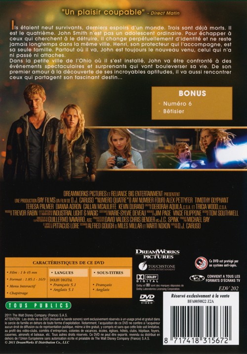 Trois sont déjà morts. Qui sera le quatrième ? Un adolescent extraordinaire, John Smith, fuit devant des ennemis prêts à tout pour le détruire. Changeant perpétuellement d’identité, ne restant jamais longtemps dans la même ville, il est accompagné par Henri, qui veille sur lui. Partout où il va, John est le nouveau venu, celui qui n’a aucun passé. Dans la petite ville de l’Ohio où il s’est installé, il va vivre des événements inattendus qui vont changer sa vie. De son premier amour à la découverte de ses incroyables aptitudes, il va aussi se lier à des personnes qui partagent son fascinant destin...