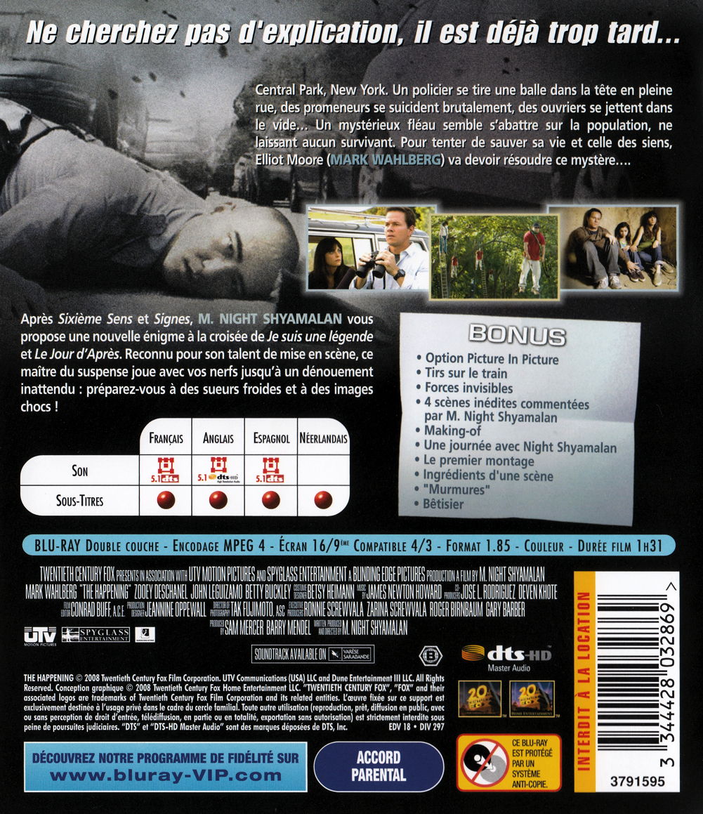 Central Park, New York. Un policier se tire une balle dans la tête en pleine rue, des promeneurs se suicident brutalement, des ouvriers se jettent dans le vide... Un mystérieux fléau semble s'abattre sur la population, ne laissant aucun survivant. Pour tenter de sauver sa vie et celle des siens, Elliot Moore (Mark Wahlberg) va devoir résoudre ce mystère...