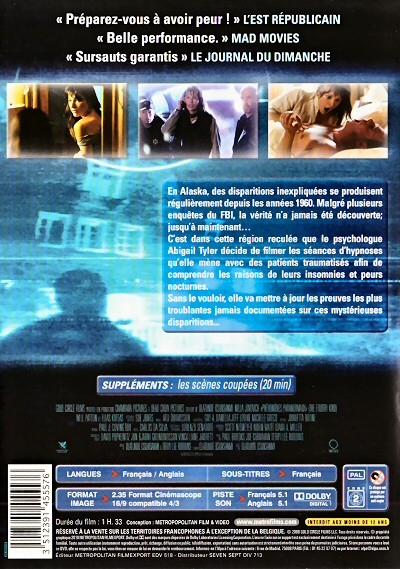 En Alaska, des disparitions inexpliquées se produisent régulièrement depuis les années 1960. Malgré plusieurs enquêtes du FBI, la vérité n'a jamais été découverte; jusqu’à maintenant... C’est dans cette région reculée que le psychologue Abigail Tyler décide de filmer les séances d’hypnoses qu’elle mène avec des patients traumatisés afin de comprendre les raisons de leurs insomnies et peurs nocturnes. Sans le vouloir, elle va mettre à jour les preuves les plus troublantes jamais documentées sur ces mystérieuses disparitions...