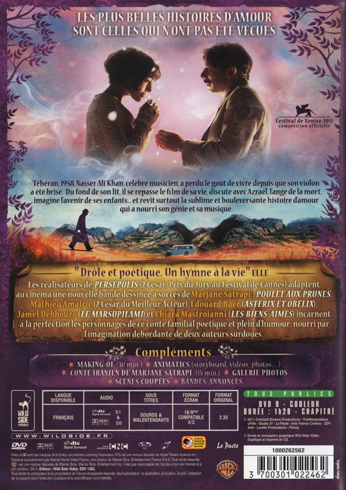 Téhéran, 1958. Depuis que son violon tant aimé a été brisé, Nasser Ali Khan, un des plus célèbres musiciens de son époque, a perdu le goût de vivre. Ne trouvant aucun instrument digne de le remplacer, il décide de se mettre au lit et d'attendre la mort. En espérant qu'elle vienne, il s'enfonce dans de profondes rêveries aussi mélancoliques que joyeuse, qui, tout à la fois, le ramènent à sa jeunesse, le conduisent à parler à Azraël, l'ange de la mort, et nous révèlent l'avenir de ses enfants... Au fur et à mesure que s'assemblent les pièces de ce puzzle, apparaît le secret bouleversant de sa vie : une magnifique histoire d'amour qui a nourri son génie et sa musique...