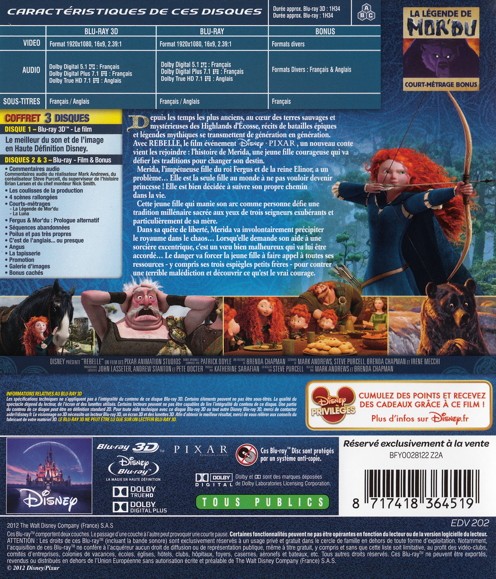 Depuis la nuit des temps, au coeur des terres sauvages et mystérieuses des Highlands d'Ecosse, récits de batailles épiques et légendes mythiques se transmettent de génération en génération. Merida, l'impétueuse fille du roi Fergus et de la reine Elinor, a un problème... Elle est la seule fille au monde à ne pas vouloir devenir princesse ! Maniant l'arc comme personne, Merida refuse de se plier aux règles de la cour et défie une tradition millénaire sacrée aux yeux de tous et particulièrement de sa mère. Dans sa quête de liberté, Merida va involontairement voir se réaliser un voeu bien malheureux et précipiter le royaume dans le chaos. Sa détermination va lui être cruciale pour déjouer cette terrible malédiction...