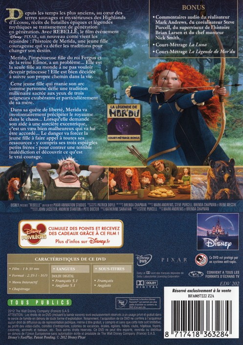 Depuis la nuit des temps, au coeur des terres sauvages et mystérieuses des Highlands d'Ecosse, récits de batailles épiques et légendes mythiques se transmettent de génération en génération. Merida, l'impétueuse fille du roi Fergus et de la reine Elinor, a un problème... Elle est la seule fille au monde à ne pas vouloir devenir princesse ! Maniant l'arc comme personne, Merida refuse de se plier aux règles de la cour et défie une tradition millénaire sacrée aux yeux de tous et particulièrement de sa mère. Dans sa quête de liberté, Merida va involontairement voir se réaliser un voeu bien malheureux et précipiter le royaume dans le chaos. Sa détermination va lui être cruciale pour déjouer cette terrible malédiction...