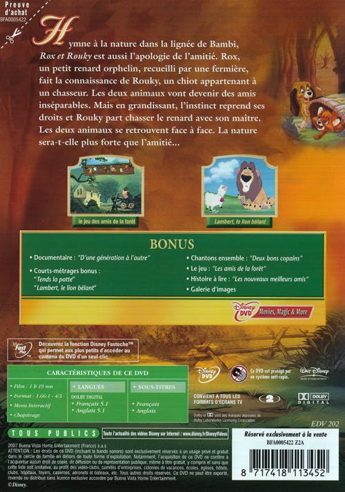 Rox, un petit renard orphelin, recueilli par une fermière, fait la connaissance de Rouky, un chiot appartenant à un chasseur. Les deux animaux vont devenir des amis inséparables. Mais en grandissant, l'instinct reprend ses droits et Rouky part chasser le renard avec son maître. Les deux animaux se retrouvent face à face...