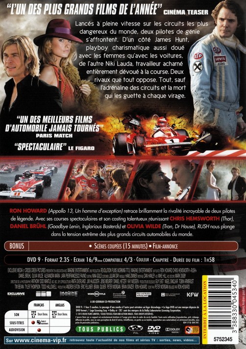 Rush retrace le passionnant et haletant combat entre deux des plus grands rivaux que l’histoire de la Formule 1 ait jamais connus, celui de James Hunt et Niki Lauda concourant pour les illustres écuries McLaren et Ferrari. Issu de la haute bourgeoisie, charismatique et beau garçon, tout oppose le play-boy anglais James Hunt à Niki Lauda, son adversaire autrichien, réservé et méthodique. RUSH suit la vie frénétique de ces deux pilotes, sur les circuits et en dehors, et retrace la rivalité depuis leurs tout débuts.