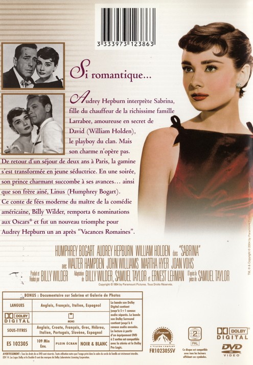 Audrey Hepburn interprète Sabrina, fille du chauffeur de la richissime famille Larrabee, amoureuse en secret de David (William Holden), le playboy du clan. Mais son charme n’opère pas. De retour d’un séjour de deux ans à Paris, la gamine s’est transformée en jeune séductrice. En une soirée, son prince charmant succombe à ses avances... ainsi que son frère ainé, Linus (Humphrey Bogart). Ce conte de fées moderne du maître de la comédie américaine, Billy Wilder, remporta 6 nominations aux Oscars et fut un nouveau triomphe pour Audrey Hepburn un an après "Vacances Romaines".