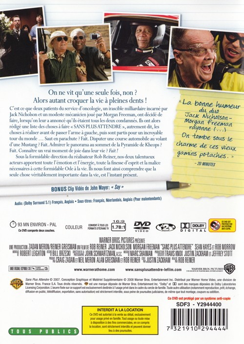 A l'époque où il enseignait la philosophie, Carter Chambers invitait chaque année ses étudiants à dresser ce qu'il appelait une "bucket list" - la liste de tout ce que ces jeunes rêvaient de faire, de voir ou de tenter avant de "passer l'arme à gauche". Oubliant d'appliquer ce sage principe à lui-même, Carter laissa passer le temps, se sent piéger par une multitude de contraintes et d'obligations familiales et dut se contenter pendant quatre décennies d'un obscur emploi de mécanicien. Aujourd'hui, sa "bucket list" n'est plus qu'un dérisoire exercice mental, une recension d'occasions manquées et de regrets voilés. Pendant ce temps, le multimillionnaire Edward Cole bâtissait un empire et consacrait toute son énergie à amasser encore plus d'argent, sans même s'accorder le temps de savourer ses acquis.
