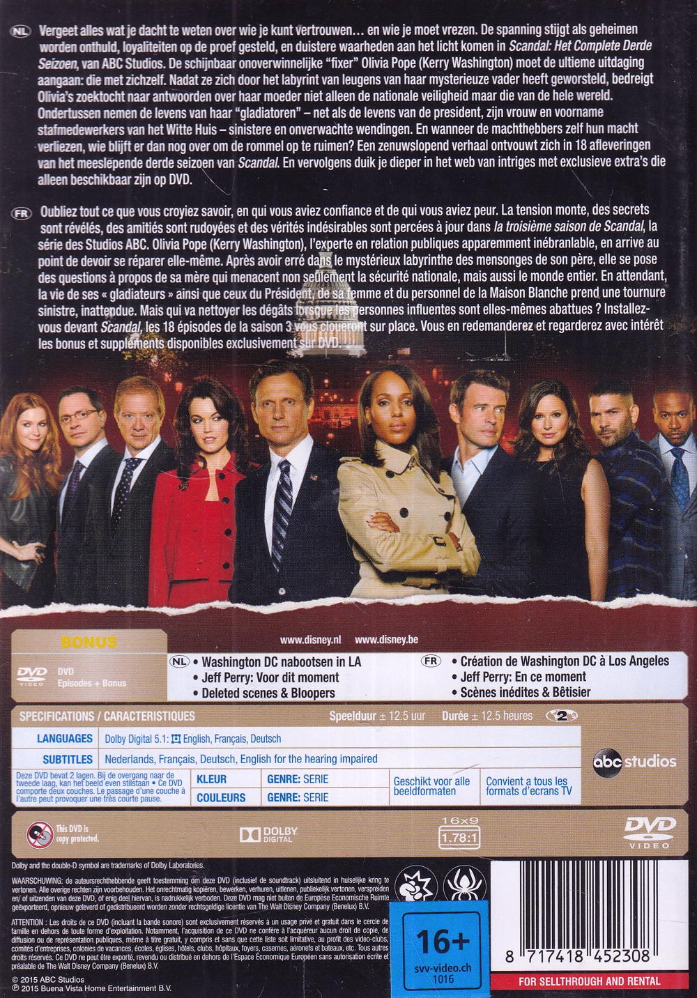 Oubliez tout ce que vous croyiez savoir, en qui vous aviez confiance et de qui vous aviez peur. La tension monte, des secrets sont révélés, des amitiés sont rudoyées et des vérités indésirables sont percées à jour dans la troisième saison de Scandal, la série des Studios ABC. Olivia Pope (Kerry Washington), l'experte en relation publiques apparemment inébranlable, en arrive au point de devoir se réparer elle-même. Après avoir erré dans le mystérieux labyrinthe des mensonges de son père, elle se pose des questions à propos de sa mère qui menacent non seulement la sécurité nationale, mais aussi le monde entier. En attendant, la vie de ses « gladiateurs » ainsi que ceux du Président, de sa femme et du personnel de la Maison Blanche prend une tournure sinistre, inattendue. Mais qui va nettoyer les dégâts forsque les personnes influentes sont elles-mêmes abattues? Installezvous devant Scandal, les 18 épisodes de la saison 3 võus cloueront sur place. Vous en redemanderez et regarderez avec intérêt les bonus et suppléments disponibles exclusivement sur DVD.