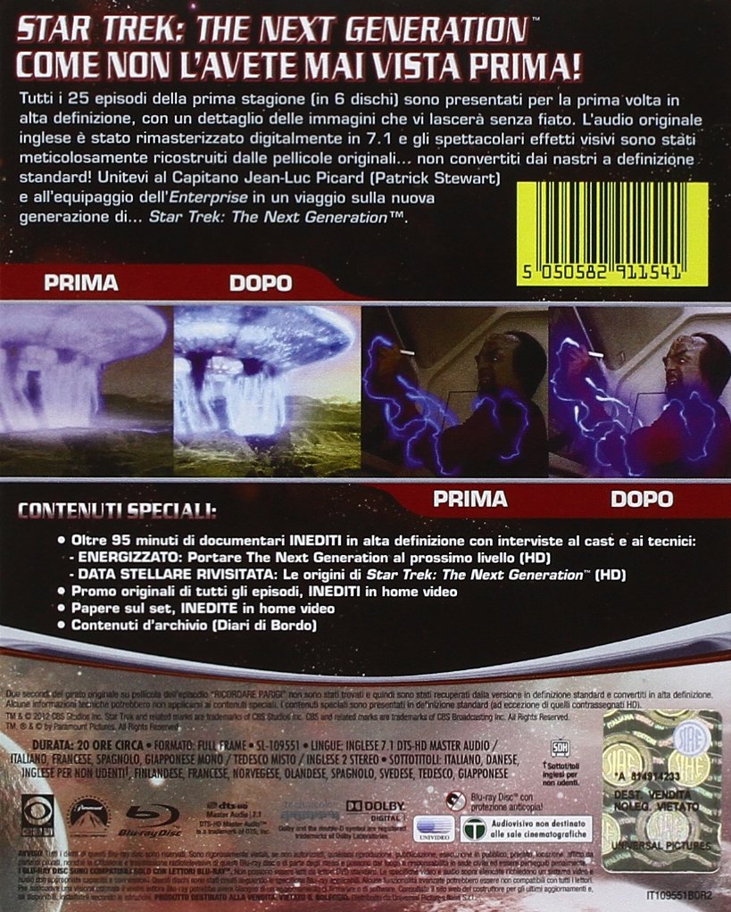 Tutti i 25 episodi della prima stagione (in 6 dischi) sono presentati per la prima' volta in alta definizione, con un dettaglio delle immagini che vi lascerà senza fiato. L'audio originale inglese è stato rimasterizzato digitalmente in 7.1 e gli spettacolari effetti visivi sono stati meticolosamente ricostruiti dalle pellicole originali... Non convertiti dai nastri a definizione standard! Unitevi al Capitano Jean-Luc Picard (Patrick Stewart) e all'equipaggio dell'Enterprise in un viaggio sulla nuova generazione di... Star Trek: The Next Generation TM.