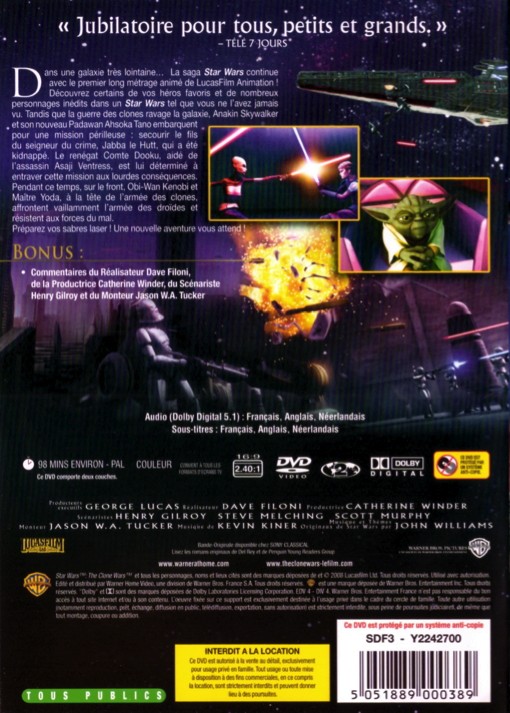 Dans une galaxie très lointaine... La saga Star Wars continue avec le premier long métrage animé de LucasFilm Animation! Découvrez certains de vos héros favoris et de nombreux personnages inédits dans un Star Wars tel que vous ne lavez jamais vu. Tandis que la guerre des clones ravage la galaxie, Anakin Skywalker et son nouveau Padawan Ahsoka Tano embarquent pour une mission périlleuse: secourir le fils du seigneur du crime, Jabba le Hutt, qui a été kidnappé. Le renégat Comte Dooku, aidé de l'assassin Asaji Ventress, est lui déterminé à entraver cette mission aux lourdes conséquences. Pendant ce temps, sur le front, Obi-Wan Kenobi et Maître Yoda, à la tête de l'armée des Clones, affrontent vaillamment l'armée des droïdes et résistent aux forces du mal. Préparez vos sabres laser! Une nouvelle aventure vous attend!