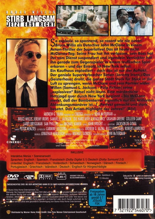 Noch explosiver, noch spannender und so rasant wie nie zuvor: Bruce Willis als Detective John McClane in einem Action-Thriller der Superlative! Das ist heute nicht McClanes Tag: Seine Frau hat ihn verlassen, sein Boss hat ihn vom Dienst suspendiert und irgendein Verrückter hat ihn gerade zum Gegenspieler in einem teuflischen Spiel erkoren – und der Einsatz ist New York selbst.