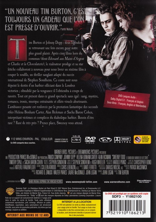 Tim Burton et Johnny Depp : Deux légendes se retrouvant une fois encore pour notre plus grand plaisir.Après cinq films hors du commun (dont Edward aux mains d'argent et Charlie et la chocolaterie), le réalisateur prodige et sa star fétiche collaborent à nouveau pour nous livrer un sixième film à couper le souffle, un thriller sanglant adapté du succès international de Stephen Sondheim.Ce conte noir nous dépeint le destin d'un barbier officiant dans le Londres Victorien : obnubilé par la vengeance, il l'obtiendra à coups de rasoirs.Tout est présent dans ce grand spectacle sans égal : sang mystère, romance, ironie, musique entrainante et effets visuels ahurissants. L'ambiance pesante est renforcé par la prestation fantastique des seconds rôles Helena Bonham Carter, Allan Rickman, et Sacha Baron Cohen, interprétant victimes et complices du diabolique barbier.Besoin d'être rasé?Rasé de très près?Prenez place, Sweeney vous attend.