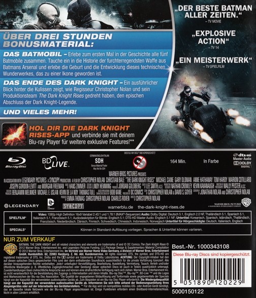 Vor acht Jahren, als er die Schuld am Tod von Staatsanwalt Harvey Dent auf sich nahm, verschwand der in Ungnade gefallene Batman in die Dunkelheit. Doch alles ändert sich radikal mit dem Erscheinen einer gerissenen, katzenhaften Einbrecherin und dem Auftreten von Bane, einem skrupellosen Terroristen. Banes Herrschaft zwingt Bruce Wayne dazu, sein selbst gewähltes Exil aufzugeben und den ultimativen Kampf aufzunehmen, um das Überleben von Gotham City zu sichern... und sein eigenes.