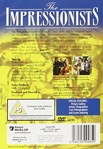 A stunning drama bringing vividly to life the French Impressionists struggle for recognition in the face of massive hostility from the art world of the late 19th Century. The delicate hues of Monets water lilies and Degas exquisite ballerinas contrast sharply with the real story of huge controversy, scandal and rivalries which emerges in this sumptuous drama based on an extensive archive of letters and documentary evidence. Beset by poverty, living through massive social upheaval and battling the art establishment, the Impressionists really suffered for their art yet their enduring friendship and commitment to this innovative style of painting was to survive all the rows, rivalries, duels and crises to leave a lasting and much loved legacy...
