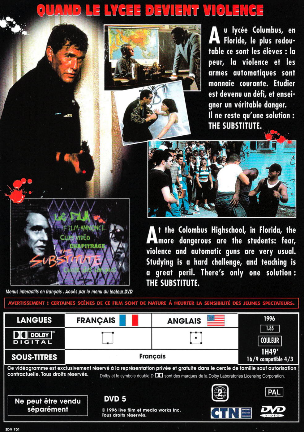 Au lycée de Colombus, en Floride, le plus redoutable ce sont les élèves : la peur, la violence et les armes automatiques sont monnaie courante. Etudier est devenu un défi, et enseigner un véritable danger. Il ne reste qu'une solution : The Substitute...