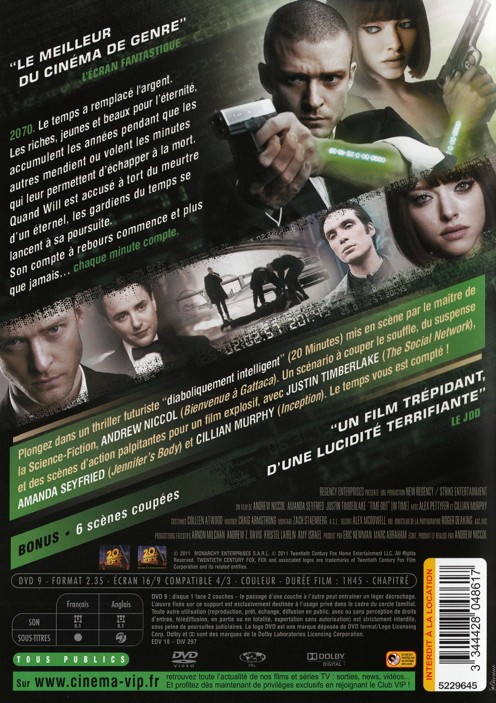 2070. Le temps a remplacé l'argent. Les riches, jeunes et beaux pour l'éternité accumulent les années pendant que les autres mendient ou volent les minutes qui leur permettent d'échapper à la mort. Quand Will est accusé à tort du meurtre d'un éternel, les gardiens du temps se lancent à sa poursuite.