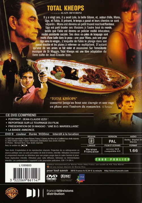 Il y a vingt ans, il y avait Lole, la belle Gitane, et, autour d'elle, Manu, Ugo, et Fabio. A présent, le temps a passé et leurs chemins se sont séparés : Manu est devenu un petit truand macho et flambeur. Ugo est parti brader ses illusions à l'autre bout du monde, tandis que Fabio est devenu un policier moitié éducateur, moitié assistante sociale. Ses deux ex-potes de braquage sont morts d'une balle dans la peau : une pour Manu, puis une pour Ugo venu le venger... L'enquête de Fabio le plonge dans son passé trouble et les plaies à refermer se multiplient. D'autant qu'une de ses amies se fait violer et assassiner. Sur l'envoûtante musique de Di Maggio, Total Kheops est une libre adaptation du roman culte de Jean-Claude Izzo.